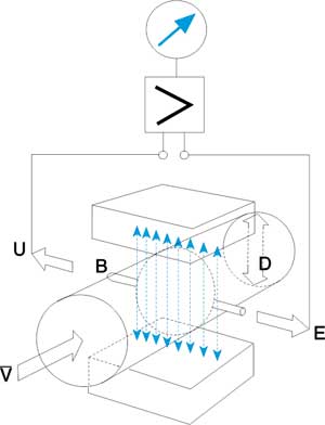B-磁通密度;D-測量管內(nèi)徑;V-流量信號(hào)(電動(dòng)勢);U-液體平均軸向流速