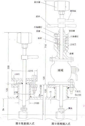 簡易插入式渦街流量計結構見圖8,球閥插入式渦街流量計結構見圖9,當松動六角螺釘,轉動把手將測頭提高到球閥以上時,關閉球閥,實現(xiàn)不斷流檢修。 ![]() 插入式渦街流量計安裝特殊要求 1、 插入式渦街流量計安裝垂直度不大于±5° 2、 測頭應插入被測管道的中心位置,其軸線偏離不大于0.02DN 3、 測頭軸線與被測管道軸線之夾角不大于±5° 4、 插入式渦街流量計流向標與流體的流動方向應一致。