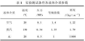 為驗(yàn)證仿真分析得到的結(jié)論,利用負(fù)壓法音速噴嘴氣體流量計(jì)量標(biāo)準(zhǔn)裝置、蒸汽實(shí)流計(jì)量標(biāo)準(zhǔn)裝置和水流量計(jì)量標(biāo)準(zhǔn)裝置對該結(jié)構(gòu)類型的渦街流量計(jì)進(jìn)行三種介質(zhì)的實(shí)驗(yàn)研究,各測試條件參數(shù)如表 1 所示。