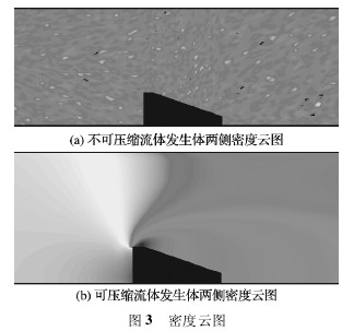 根據(jù)公式 ( 1) 可知,影響渦街流量計(jì)旋渦頻率的是發(fā)生體兩側(cè)的流速 U1和發(fā)生體的結(jié)構(gòu),由于發(fā)生體結(jié)構(gòu)尺寸是固定的,因此頻率只與 U1相關(guān),需要觀測在相同入口流速 U 的條件下 U1變化來得到頻率的變化,而速度的變化必然會導(dǎo)致流體密度的變化,因此可觀測發(fā)生體兩側(cè)的密度云圖,來判斷可壓縮性對渦街流量計(jì)流速 U1的影響,通過仿真得到如圖 3 ( a) 所示的不可壓縮流體發(fā)生體兩側(cè)的密度云圖和如圖 3 ( b) 所示的可壓縮流體發(fā)生體兩側(cè)的密度云圖。
