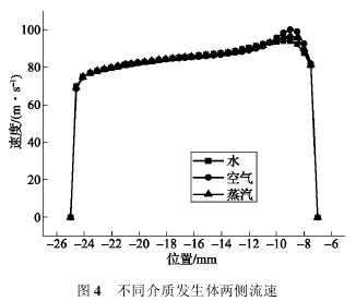 根據(jù)圖 3 得到的結(jié)論,對渦街流量計(jì)進(jìn)行蒸汽、空氣和水三種介質(zhì)下的軟件仿真,設(shè)置三種介質(zhì)的入口流速均為 50 m/s,取渦街發(fā)生體迎流面?zhèn)壤庵悬c(diǎn)與管壁連線,如圖 2 中線段 ab所示。取該線上的速度值,將蒸汽、空氣和水三種介質(zhì)下的速度曲線進(jìn)行比較,結(jié)果如圖 4所示。