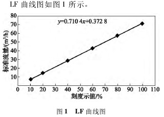 玻璃管轉子流量計具有結構簡單、工作可靠、線性刻度、讀數(shù)直觀等特點,屬于變面積式流量計的一種,在工業(yè)計量中應用廣泛。一般出廠時對玻璃管粗細均勻程度要求較高,但其粗糙的刻線使得其在使用中誤差非常大。由于玻璃管自身是錐體的,所以無法均勻分割刻線以達到與標準流量相接近的目的。為了達到預期使用目標,本著方便快捷、經濟合理的原則,本文以LZB-50和LF百分比型兩種流量計為例,采用鐘罩式氣體流量標準裝置,介紹如何把刻度示值無限接近地修正到標準流量。 1.相關概念 刻度示值:玻璃管或坐標紙上標刻的讀數(shù),單位為m3/h,有時也用百分比。 標準流量:在101325Pa,20℃狀態(tài)下的流量,單位為m3/h。 引用誤差:(刻度示值-標準流量)/量程上限×100%。 2.LZB-50型流量計 (1)把轉子流量計按玻璃管上的刻度示值做一遍檢定,得到如表1所示數(shù)據(jù),從中可以看出刻度示值為“100”和“80”時的引用誤差非常大,已經無法正常使用(JJG257—2007《浮子流量計檢定規(guī)程》中規(guī)定引用誤差最大為5%)。 (2)用坐標紙測量一下玻璃管上刻度示值“100”與“80”之間有多少小格(1小格=1mm),測得“100”與“80”之間有66mm。 (3)把刻度示值“100”對應的標準流量105.080m3/h減去刻度示值“80”對應的標準流量85.764m3/h,計算出“100”與”80”之間相差的標準流量。即 105.080-85.764=19.316m3/h (4)計算出刻度示值“100”與“80”之間每毫米對應多少m3/h。即 19.316/66=0.29266m3/h (5)以標準流量105.08m3/h為基準,找出標準流量為100m3/h時對應到玻璃管上的位置。即 105.08-100=5.08m3/h 5.08/0.29266=17.4mm (6)由(5)中的兩個式子可以得出,標準流量為100m3/h和105.080m3/h時在玻璃管上的位置相差17.4mm。在坐標紙上找一起始刻線,并在玻璃管左側與“100”橫豎對齊并固定好,從坐標紙的起始刻線處向下移動17.4mm,該位置就是標準流量為100m3/h時的位置,在此處畫一橫線作標記,記數(shù)為100。以后把浮子升到該位置就可較為正確地得到100m3/h的標準流量。 7)上述步驟只得到刻度示值“100”的修正,同理可以得出80與60,60與40,40與20相差的距離,通過向下調整而得到所需修正值。如果我們認為某點滿足使用不用修正,那么就可以對照玻璃管上的刻線直接畫過來。 (8)修正完所有刻度示值后,按照坐標紙上的刻度示值重新檢定。得到如表2所示數(shù)據(jù),從中可看出刻度示值為“100”與“80”時的引用誤差已變?yōu)?.28%,0.39%,明顯優(yōu)于修正前。 3.LF百分比型流量計 按玻璃管上的百分比刻度做其對應的標準流量,如表3所示。從表3可看出,假如需要60m3/h、50m3/h、40m3/h、30m3/h的標準流量時,我們是無法較為正確把浮子調到玻璃管上其對應的位置的,因此需要通過下列步驟得到我們想要的結果。 (1)根據(jù)上述數(shù)據(jù)用Excel等軟件繪制LF曲線圖轉換成線性公式得出標準流量;也可用下列公式y(tǒng)=ax+b(a為直線斜率,b為直線截距)求出標準流量。 (2)經計算得a=0.7104,b=0.3728,即y=0.7104x+0.3728。我們已經知道刻度示值“10”對應的標準流量為7.4507m3/h,那么只要以此為基準,向上找出60m3/h、50m3/h、40m3/h、30m3/h與7.4507m3/h之間的距離即可。 (3)由(2)中式子得出x=(y-0.3728)/0.7104,把所求的流量點流量(60m3/h,50m3/h,40m3/h,30m3/h)依次設為y值,得x值分別為83.9mm,69.8mm,55.7mm,41.7mm。 (4)在坐標紙上找一起始位置,并在玻璃管刻線左或右側與刻度示值“10”橫豎對齊并固定好,用鉛筆做一標記,記數(shù)為10。因為我們不需要找這個流量點,所以全部標完后要擦除該記數(shù)。 (5)以記數(shù)為10的起始刻線為基準,向上到達41.7,55.7,69.8,83.9mm處時分別做標記,畫一橫線,這些橫線標記即為所求流量點,記數(shù)為30m3/h,40m3/h,50m3/h,60m3/h。 4結論 利用價格低廉的坐標紙在玻璃管上標注刻線,克服了玻璃管流量計自身出廠時的缺陷,更加有效地提高了流量計的精度,為工業(yè)計量節(jié)約了采買新流量計的成本。