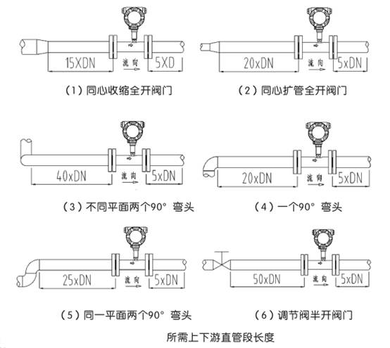渦輪流量計對管道內流速分布畸變及旋轉流是敏感的,進入傳感器應為充分發(fā)展湍流,因此要根據傳感器上游側阻流件類型配備必要的直管段或整流器,要求入口段和出口段直管段長度。