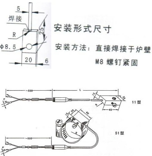 爐壁熱電偶應(yīng)用 爐壁熱電偶是采用直徑Φ4或者Φ5的鎧裝熱電偶原件作為測(cè)溫探頭,測(cè)量端用螺釘、抱箍或者焊接(采用熱電阻原件時(shí)不宜采用焊接式)等方式將測(cè)溫探頭與導(dǎo)熱板表面緊緊貼合在一起,導(dǎo)熱板的另一面有與被測(cè)面相同的曲面,導(dǎo)熱板被焊在或者卡箍緊緊與被測(cè)爐壁相貼,即可測(cè)得爐壁或者管壁的溫度。爐壁熱電偶適用于電廠鍋爐爐壁、管壁及其他圓柱體表面測(cè)溫。 爐壁熱電偶主要技術(shù)參數(shù) 型號(hào)及規(guī)格
