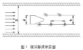 實驗證明:當兩列旋渦之間的距離h和同列兩個旋渦之間的距離L滿足L/h=0.281時非對稱旋渦列就能保持穩(wěn)定狀態(tài)。當流體雷諾數Re在5000-15000之間范圍內時,Sr基本不變,所以d和Sr為定值時旋渦發(fā)生體的頻率f與流體的平均流速成正比,即與體積流量Q成正比而與壓力、溫度、密度等無關。
