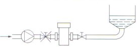 電磁流量計(jì)聚四氟乙烯襯里傳感器的安裝 用聚四氟乙烯(PTFE)管材做的電磁流量計(jì)的傳感器襯里,它與傳感器測量管管壁一般不粘貼,因此,對真空負(fù)壓是敏感的。管道內(nèi)真空會(huì)抽癟聚四氟乙烯襯里,使襯里呈波浪型拱起——典型的負(fù)壓破壞形態(tài),這樣破壞了電極的密封,傳感器就不能工作了。因此,PTFE襯里的傳感器不能用于負(fù)壓系統(tǒng),也應(yīng)盡可能避免安裝在可能產(chǎn)生瞬間負(fù)壓的地方。如傳感器不應(yīng)裝在泵的吸入端;閘閥應(yīng)裝在傳感器的后側(cè),如圖所示。