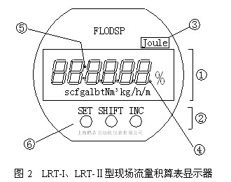 LRT-I、LRT-Ⅱ型氣體渦輪流量計現(xiàn)場流量積算表顯示器各部分說明見圖2和表1。