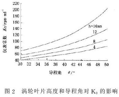 式2可見,對確定的渦輪流量傳感器)易知口徑D大, K0值小,葉片數(shù)n大, K0值大等.如果要獲得較大的儀表常數(shù),就要對渦輪傳感器的結(jié)構(gòu)參數(shù)進行優(yōu)化設(shè)計,從圖2(可以看出,葉片高度;增加, K0增大,導(dǎo)程角增大, K0增大.對于¢19的過環(huán)空大排量液體渦輪流量計而言,由上式計算得K0=74.567rpm/m3/d而水中標(biāo)定的KW=78.89rpm/m3/d,表1給出不同口徑和不同導(dǎo)程角下液體渦輪流量計固有儀表常數(shù)的計算值.