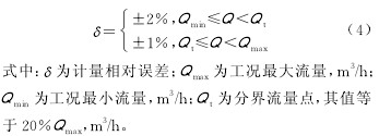 天然氣作為一種高效清潔能源,其需求量隨著全球低碳經(jīng)濟的發(fā)展呈現(xiàn)快速增長趨勢,預(yù)計2020 年國內(nèi)天然氣需求量將達 3 000×108m3[1-4]。進口渦輪流量計一直占據(jù)著高壓管道貿(mào)易計量市場,而國產(chǎn)渦輪流量計通常應(yīng)用于低壓管道,用戶主要為城市燃?xì)獾墓I(yè)用戶。 隨著工業(yè)過程控制自動化的實施及輸氣管道的大量建設(shè),對貿(mào)易計量所需的渦輪流量計和具有強大功能的流量計算機的需求量也不斷增大,因此,擁有自主知識產(chǎn)權(quán)且滿足工業(yè)性應(yīng)用要求的精度好的高壓渦輪流量計與流量計算機,對實現(xiàn)管道設(shè)備的國產(chǎn)化,打破國外技術(shù)壟斷,保障管道安全、經(jīng)濟、高效運行,具有十分重要的意義。為了評價國產(chǎn)化流量計在實際運行過程中的準(zhǔn)確度、可重復(fù)性、穩(wěn)定性及安全性等指標(biāo),為后續(xù)新建管道的推廣應(yīng)用及流量計的制造、改進提供依據(jù),對 4 臺國產(chǎn) 氣體高壓渦輪流量計和FC 型流量計算機進行了現(xiàn)場工業(yè)性試驗。 1 高壓氣體渦輪流量計 1.1 工作原理 高壓氣體渦輪流量計是一種帶機械計數(shù)器并用于準(zhǔn)確測量氣體流量的流量計,其工作原理:當(dāng)高壓氣流進入流量計時,首先經(jīng)過整流器整流并加速,在流體的作用下,渦輪克服阻力矩開始轉(zhuǎn)動;當(dāng)力矩達到平衡時,渦輪轉(zhuǎn)速穩(wěn)定,此時其轉(zhuǎn)速與氣體工況流量成正比,并通過齒輪減速傳動;磁耦合聯(lián)接驅(qū)動字輪計數(shù)器轉(zhuǎn)動,直接累積氣體的工況體積總量。 因為通過渦輪的流量與渦輪轉(zhuǎn)速成正比,所以高頻信號脈沖輸出頻率與渦輪轉(zhuǎn)速存在以下關(guān)系[7]: 綜上所述,儀表系數(shù)K 除與渦輪導(dǎo)程、葉片數(shù)、葉片寬度、螺旋升角、流量計流體通道等結(jié)構(gòu)因素有關(guān)外,還與介質(zhì)流體黏性、軸承本身阻尼、軸承潤滑油黏度等有關(guān),若以上其中一種或幾種相關(guān)因素發(fā)生改變,則儀表系數(shù)K 也會相應(yīng)改變,因此流量計應(yīng)通過線性檢定等試驗方式進行最終設(shè)計確認(rèn)。 1.2 性能測試 以 EN 12261-2002《Gas meters - Turbine gasmeters》[8]和 OIML R137-1-2006《氣體流量計》作為流量計產(chǎn)品的研制依據(jù),并嚴(yán)格按照標(biāo)準(zhǔn)進行性能測試,主要包括:耐久性試驗、彎矩與扭矩試驗、短時過載試驗、擾動試驗以及高低溫性能測試等。 1.2.1 耐久性測試 渦輪流量計進行耐久性測試的目的在于確認(rèn)流量計在指定條件下的計量性能是否符合分段要求[9],即: 確認(rèn)各種安裝位置是否影響測試樣機的計量性能,安裝位置可分為水平方向、垂直向上與垂直向下。在不同安裝位置情況下,樣機在耐久性測試前后指示誤差的變化量不得超過式(4)要求值的 1/3。 以 DN80-G100 樣機為例,進行耐久性測試說明。首先將 3 臺樣機分別安裝在同一管道的不同位置,管道內(nèi) 0.8 MPa 壓縮氣體以樣機最大流量進行循環(huán)運行,以每 1 000 h 為運行單位,將樣機拆卸并在標(biāo)準(zhǔn)氣體流量裝置上進行相應(yīng)性能測試,得到 7 000 h 運行測試數(shù)據(jù)(圖 1)。 結(jié)果表明:該測試樣機滿足耐久性測試要求,指示誤差的變化量未超過最大允許誤差的 1/3;軸承經(jīng)過長時間運行磨合更趨于穩(wěn)定,長期運行后非線性段更趨于理想特性曲線。 1.2.2 彎扭矩測試 對于高壓渦輪流量計,應(yīng)該詳細(xì)說明流量計所需的彎曲與扭力力矩的保護水平[2]。該數(shù)據(jù)可以通過試驗直接獲得(圖 2,其中直管段 1 連接氣體流量標(biāo)準(zhǔn)裝置,圖 2a 中在直管段 2 預(yù)先確定的力臂L 位置附加垂直方向的力F 而形成彎矩M;圖 2b 中在直管段 2 側(cè)面預(yù)先確定的力臂L 位置附加垂直方向的力F 而形成扭矩T,而彎矩與扭矩均是作用于流量計入口與出口法蘭處)。由于該項測試主要是針對流量計強度的校核,為了使測試結(jié)果更具說服力,并且提高其可靠性,將鋁合金殼體的中低壓渦輪流量計 DN80-G100 用于此次測試。測試過程中按照 EN 12261-2002 表 10中要求施加 1 倍、2 倍直至 4 倍(即力矩為 3 040 N·m)的砝碼F,未發(fā)現(xiàn)流量計殼體有任何異常變化。施加砝碼F 時及卸下砝碼之后得到的指示誤差與施加砝碼F 之前的指示誤差無明顯變化,實際變化量均在最大允許誤差的 1/3 以內(nèi)。 1.2.3 常壓與高壓試驗對比 為了確認(rèn)高壓渦輪流量計在高壓氣體介質(zhì)中計量性能是否滿足工業(yè)貿(mào)易計量要求,將多臺 DN80-G160樣機發(fā)往國家石油天然氣大流量計量站南京分站進行 6 MPa 實流檢定。使用小流量標(biāo)準(zhǔn)裝置對編號為131228041 的 DN80 渦輪流量計進行了檢定(圖 3)。流量計的儀表系數(shù)K 的計算公式[10] 2 FC 型流量計算機 流量計算機是一種可對多個流量測量點集中進行數(shù)據(jù)采集、精度高補償運算、數(shù)據(jù)顯示存儲及運用網(wǎng)絡(luò)實現(xiàn)通信功能的新一代以工業(yè)微型計算機為內(nèi)核的計量儀表。與體積修正儀相比,其數(shù)據(jù)采集頻率高,運算速度快且準(zhǔn)確,可以同時對多臺流量計進行溫度壓力修正和計量,廣泛應(yīng)用于石油、化工、冶金、電力、城市燃?xì)饧肮岬刃袠I(yè)的重要貿(mào)易計量場合和工廠計